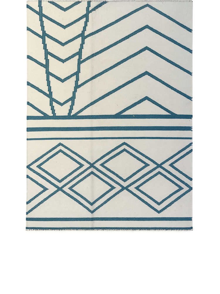 A woollen handwoven flatweave rug with a geometric design in deep teal and soft ivory. The upper section showcases bold chevron lines for a contemporary, architectural look, while the lower portion transitions into a repeating diamond motif.