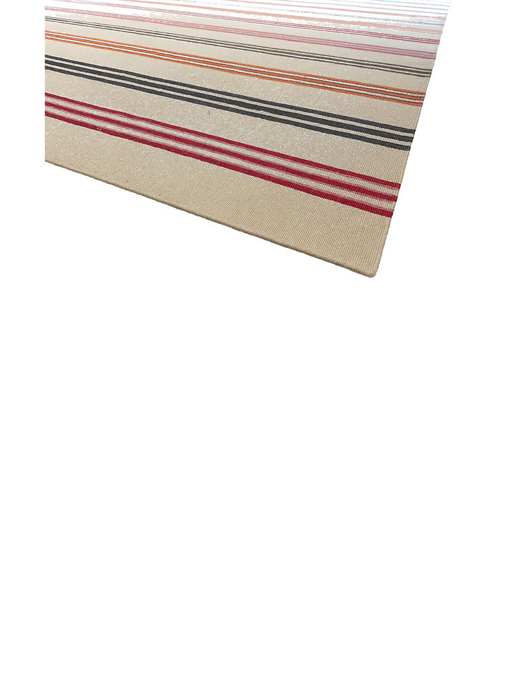 Featuring a clean cream base accented with bold horizontal stripes in red, charcoal, and burnt orange, this flatweave rug blends traditional Kilim weaving techniques with a fresh, contemporary palette.