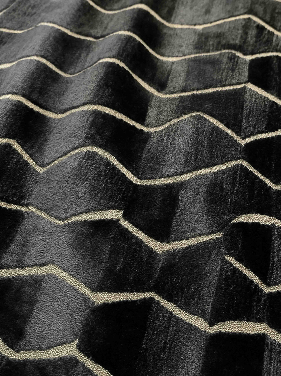 This 2.5-metre length of black geometric velvet is offered as a single, unique cut, available exactly as it is. The fabric features a sculpted, cut-velvet surface with a striking raised pattern that catches the light and creates a sense of movement across the pile. Its bold, contemporary geometry is beautifully contrasted by the deep, inky ground, giving the velvet a luxurious, architectural presence.